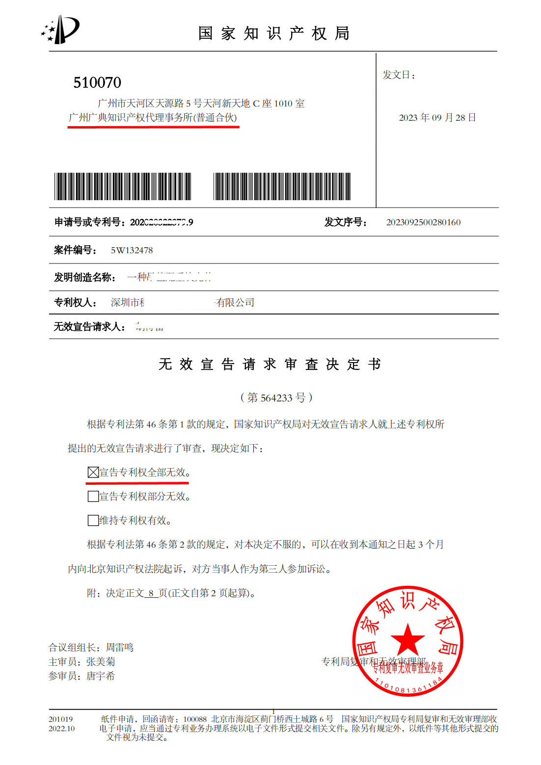作为涉嫌侵权被告的代理人、专利无效宣告请求人的代理人,广典知识产权代理事务所直面专利权人的施压,以专业的服务维护了委托人的利益。