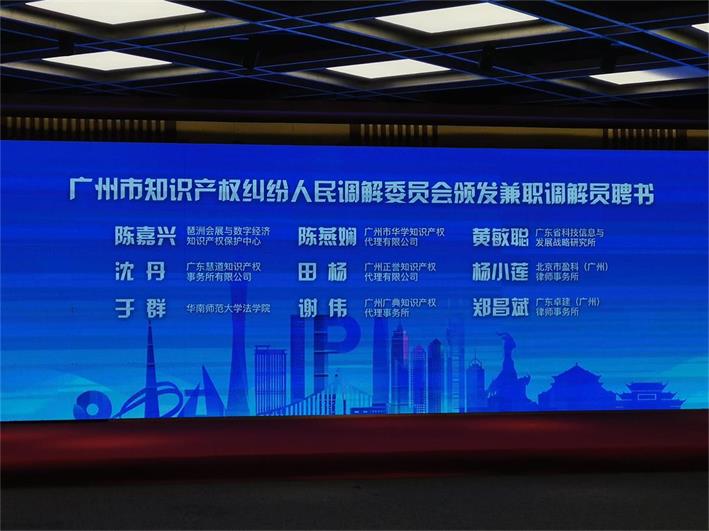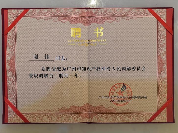 我所谢伟律师受聘担任广州市知识产权纠纷人民调解委员会兼职调解员。